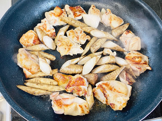 鶏肉とゴボウを焼いて煮るだけ!鶏肉は皮目を下にして焼き目を付けて香ばしく焼きましょう。