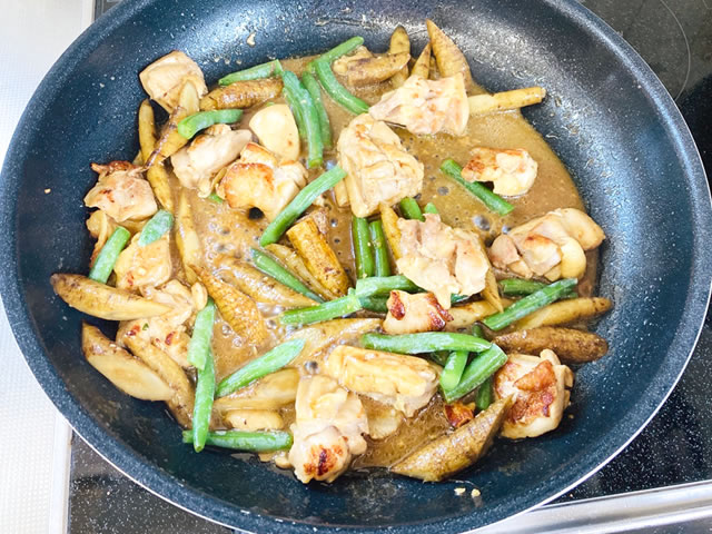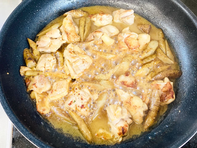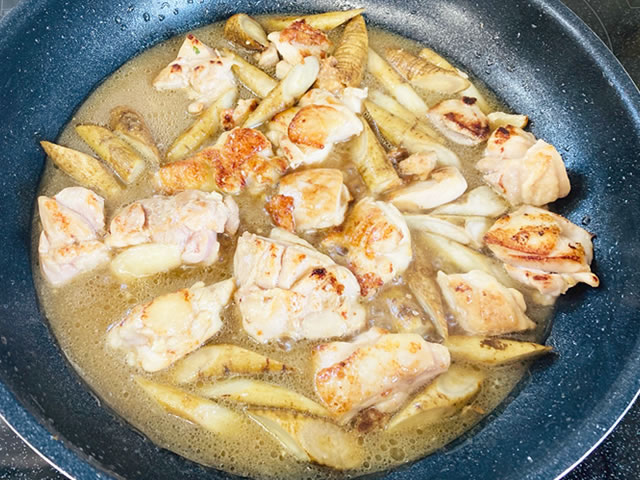 鶏肉は皮目から焼き、よく焼き目を付けてから煮るのがポイント!