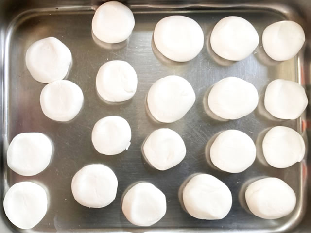 残りの水は生地の様子を見ながら少しずつ加えて、耳たぶくらいの固さになるまで練り、食べやすい大きさに丸めます。