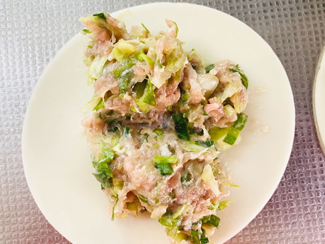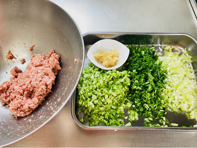 ネギとニラをみじん切りにして、生姜はすりおろし、キャベツはみじん切りにしてひとつまみの塩で揉んで10分ほどおき、キャベツから水分が出てきたらペーパータオルに適量包んで絞ります。