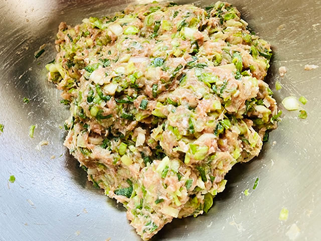 下味のついたひき肉と野菜を混ぜ合わせます。