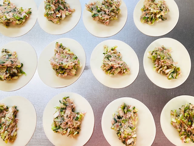 餃子を作るときには、餃子の皮を一度全部並べて、タネを同じくらいになるように置いていくのがポイント☆