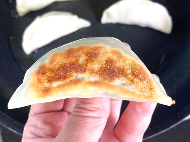 餃子の用意ができたら焼きますよー!底面が色づいて、こんな風にこんがりするまで焼くのが目安です☆