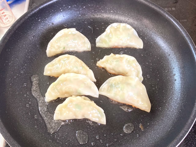 フライパンにサラダ油を中火で熱し、餃子を並べて入れ、焼き色が付くまで2分ほど焼きます。