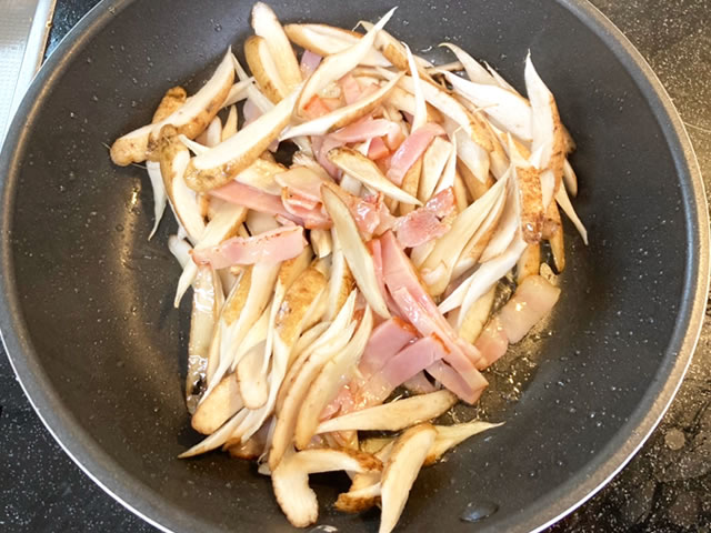 フライパンを温めてオリーブ油を引いて、ごぼうとベーコン、刻みにんにくを炒めます。