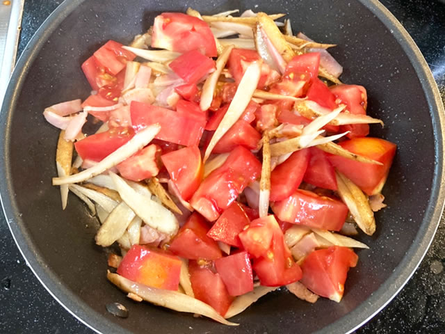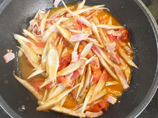 ごぼうとベーコンに油が回ったらトマトを入れます。