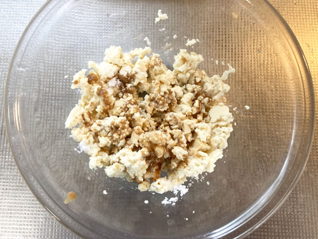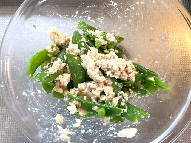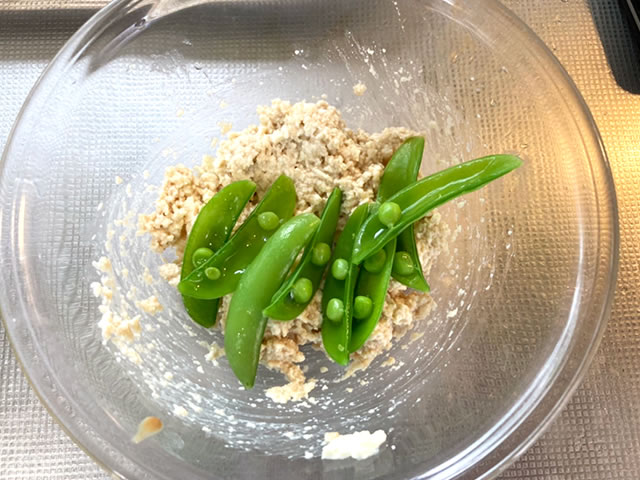 ボウルに調味料全てを混ぜ合わせたら、豆腐を加えて崩しながら調味料と混ぜ、スナップえんどうを加えます。