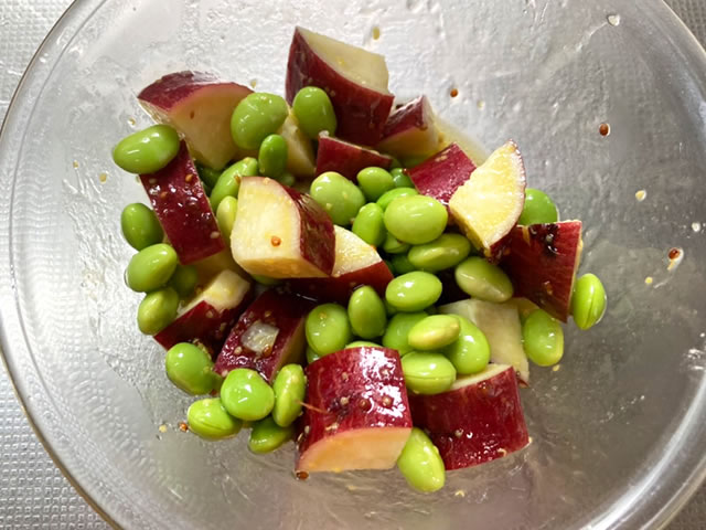 茹でたさつまいもと枝豆を調味料と合わせるだけ!