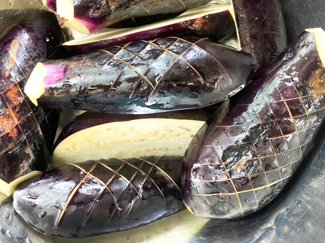 なすのへたを取り縦半分に切ったら、格子状に切れ目を入れ、5分程水にさらしてアク抜きをします。