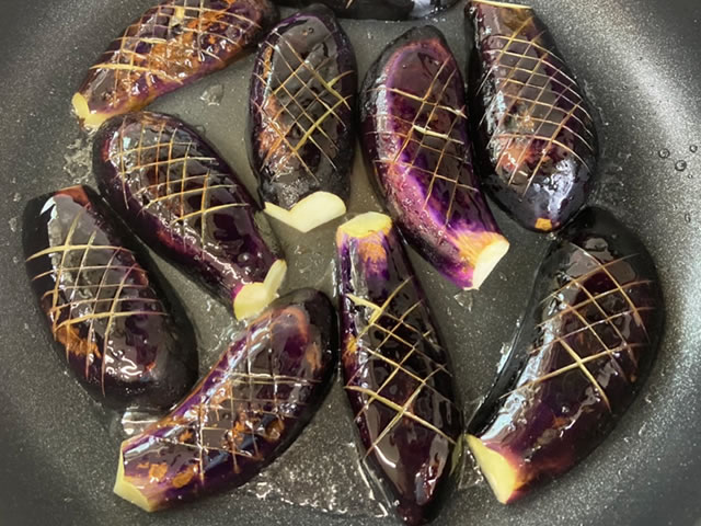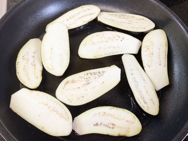 フライパンに油をひき、なすを皮の方から焼いていきます。