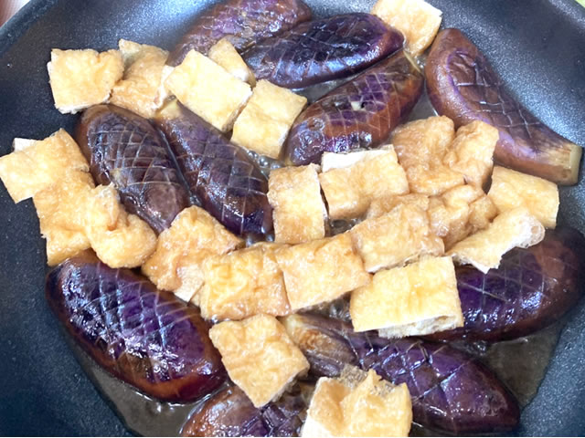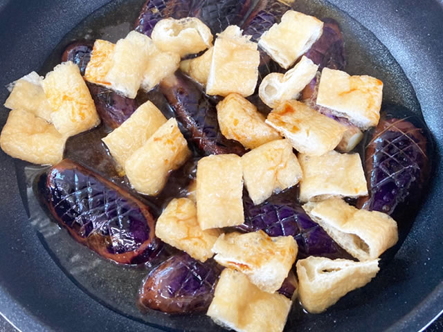 両面焼き目が付いたら、油揚げと調味料を入れます。