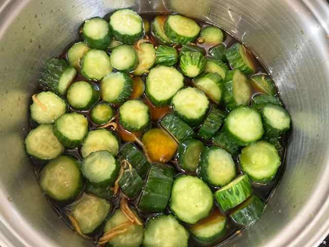 沸騰した汁に先ほど分けたきゅうりと生姜をもう一度戻して、粗熱がとれるまで待ちます。