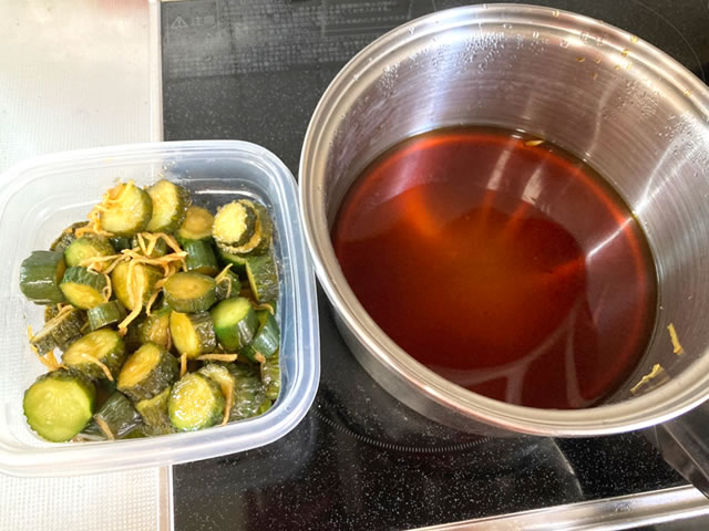鍋に入れた状態で常温まで冷まし、冷めたらきゅうり・生姜と汁を分けます。