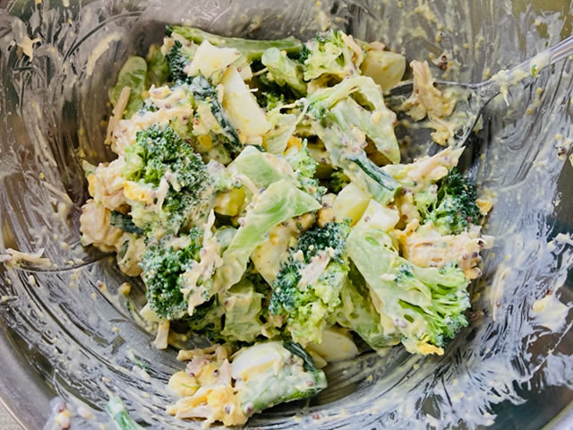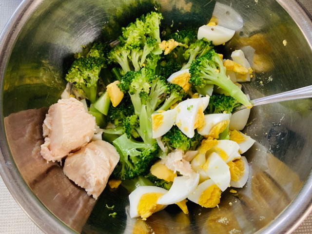 全体に調味料が馴染むように、ブロッコリーとチキン缶を和え、ゆで卵は最後に軽く合わせるようにしましょう。