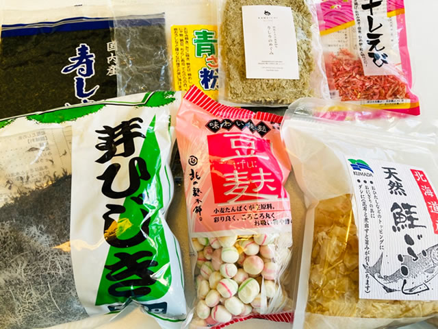 上の写真は海苔、青さ、とろろ昆布、桜海老、麩、鰹節、芽ひじき。
