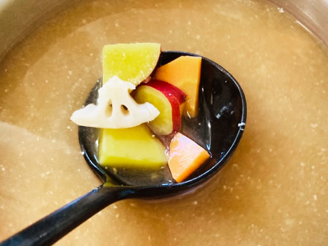 こちらはさつまいも、れんこん、にんじんのお味噌汁。さつまいもと人参の甘みがやさしい(^^)
