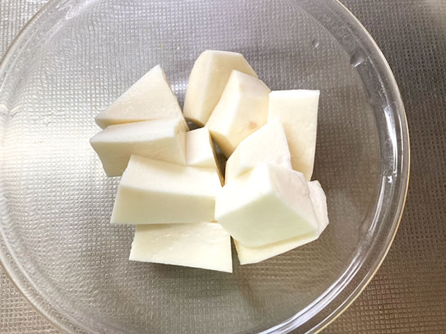 長芋は皮を剥いて小さく乱切りし、耐熱ボウルに入れてラップをふわっとかけ、レンジ600Wで4分加熱します。