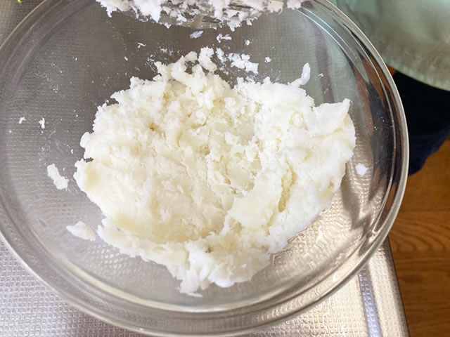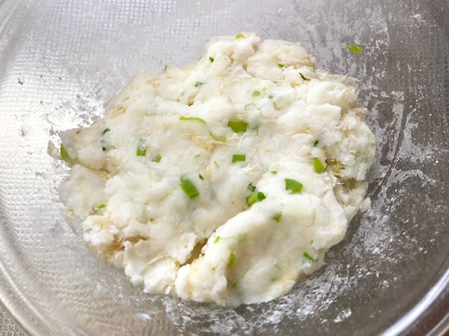 ポイントは片栗粉!片栗粉を混ぜることで生地がまとまりやすくなり、お餅の形を作れるので片栗粉は忘れずに!