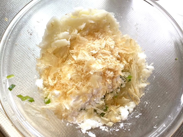 小口切りにしたネギと鰹節、片栗粉を入れます。