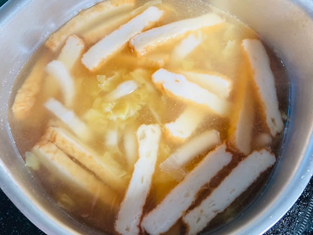 こちらは、合わせ味噌で作った「さつま上げと白菜のお味噌汁」。