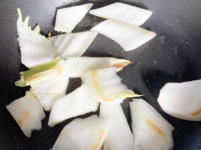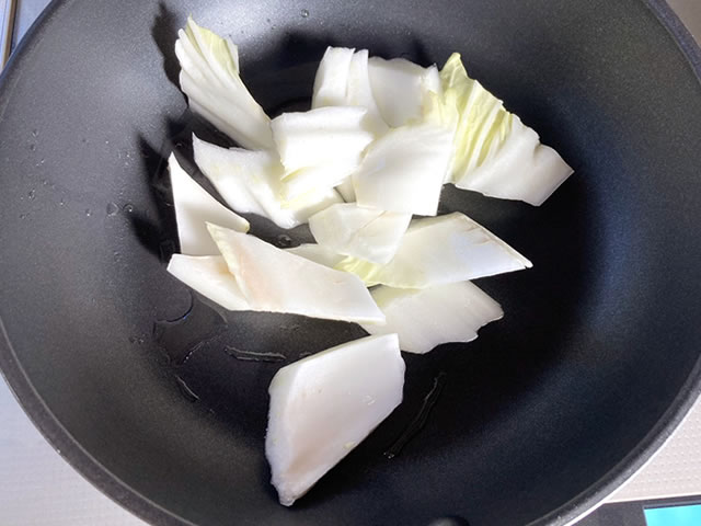 白菜は食べやすい大きさに切り、フライパンに油を引いて中火で熱し、白菜の芯から炒めます。