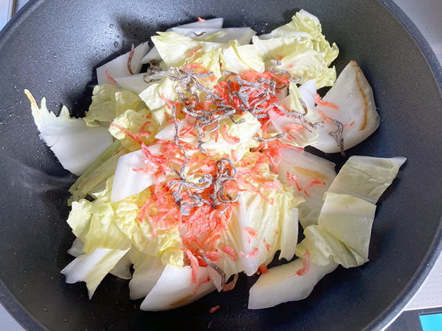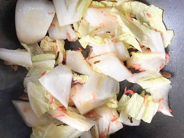 白菜はじっくり炒めたほうが好き!と言う方は、芯の部分をよく炒めてから桜えびや塩昆布を入れましょう!