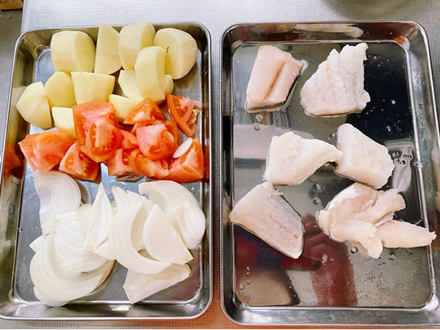 玉ねぎは縦薄切り、じゃがいもは皮をむき、タラと同じくらいの大きさに切り、トマトはざく切りにします。