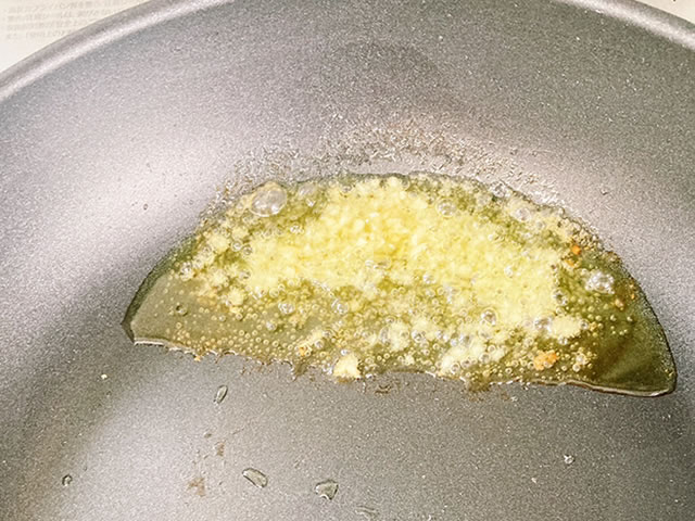 鍋にオリーブ油と刻みにんにくを入れて、香りが出てくるまで弱火で炒めます。