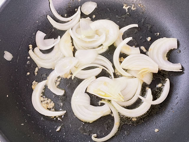 玉ねぎを加えて中火で炒めます。