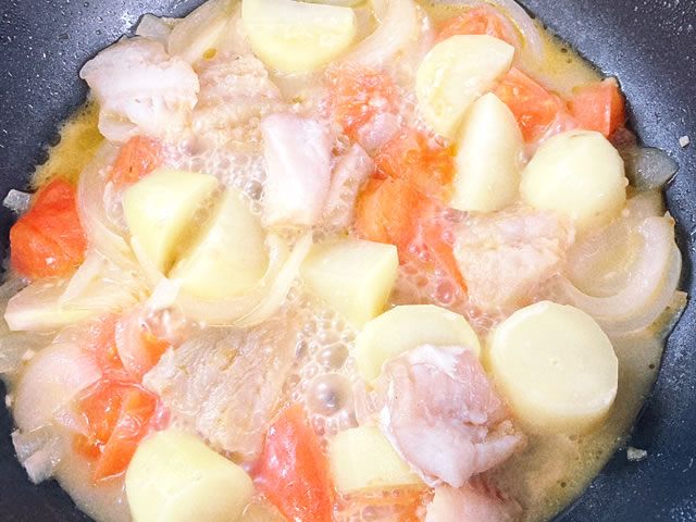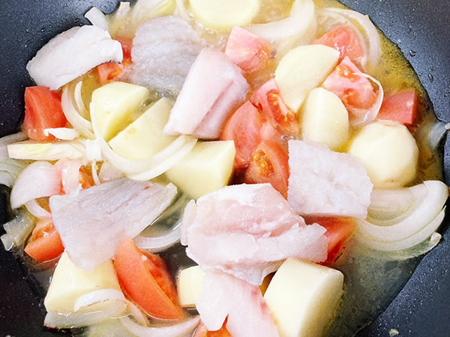 じゃがいも、トマト、タラを玉ねぎの上に乗せて、白ワインを入れ、蓋をして10分蒸し煮にします。