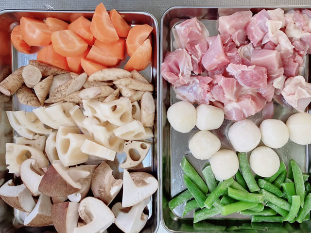 野菜と鶏もも肉は食べやすい大きさに切っておきます。里芋といんげんは冷凍野菜でラクチンしちゃいます!