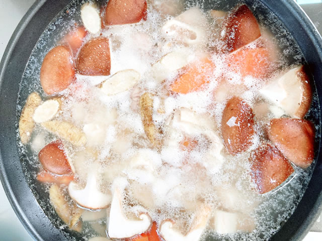 先に具材を下茹ですることで、調理中にちょこちょこあくをすくわなくても良くなりラクチン!(^^)