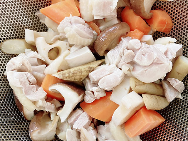 下茹でしておくと、鶏肉の余分な油と臭みを取ることができ、味も染み込みやすくなります(^^)