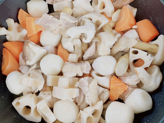 先ほど使っていたフライパンをさっと拭き、フライパンが温まったらサラダ油を引いて、下茹でした具材と里芋を入れて炒めます。