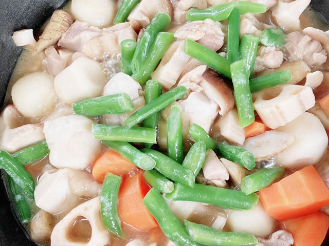 里芋といんげんは、前回レシピ(里芋と鶏もも肉の甘辛煮)と同様に冷凍野菜を使うので、これまたラクチン☆