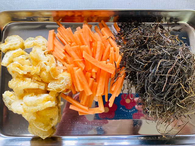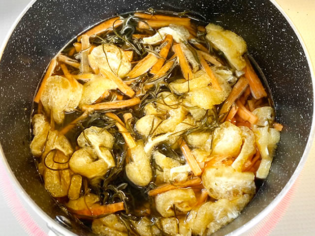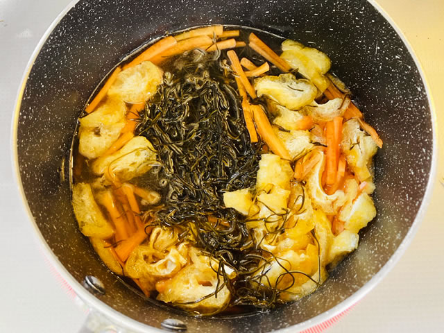 きざみ昆布は水洗いし、小揚げはキッチンペーパーで油切りをして横半分に切ったら1cm幅の細さに切ります。