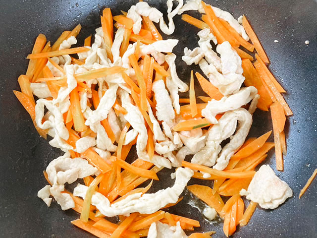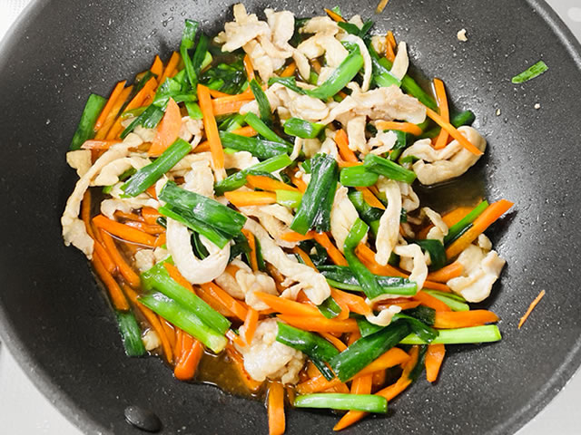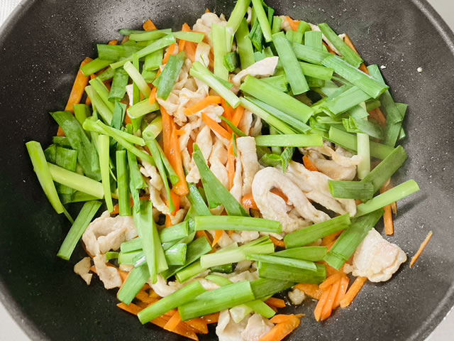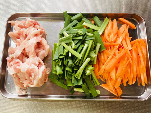 人参は千切り、ニラは人参と同じくらいの長さに切り、豚肉は細切りにして塩胡椒で下味を付けておきます。