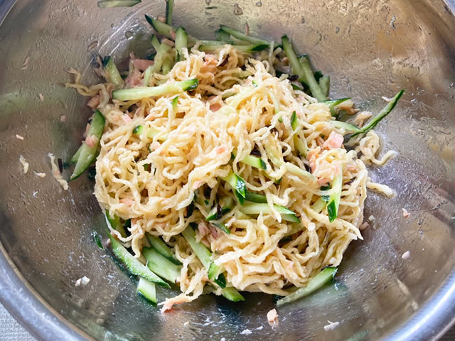 千切りしたきゅうりと切り干し大根、塩昆布、ツナ缶、調味料を全て合わせるだけ!
