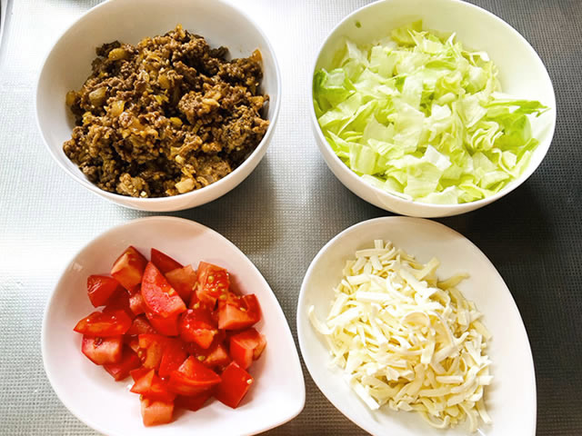 タコライスの「タコ」はタコスのことで、味付けしたひき肉と野菜を「ライス」の上に乗せて食べる沖縄料理のひとつですね!
