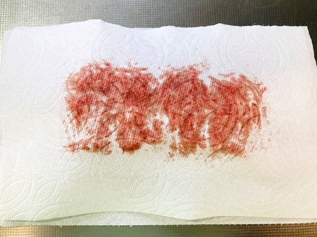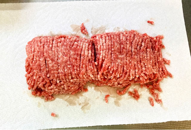 まずはひき肉のドリップを取ります。パックからひき肉を取り出し、ペーパータオルの上に乗せます。