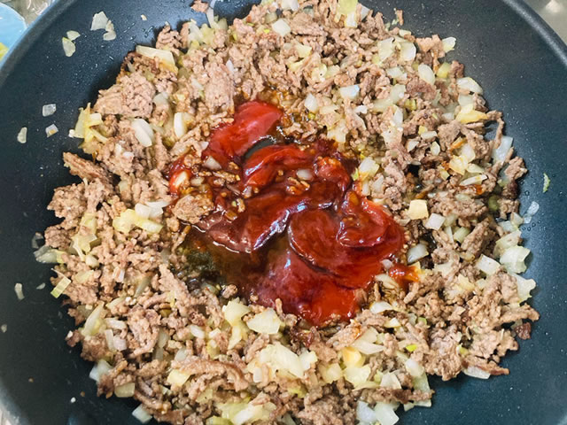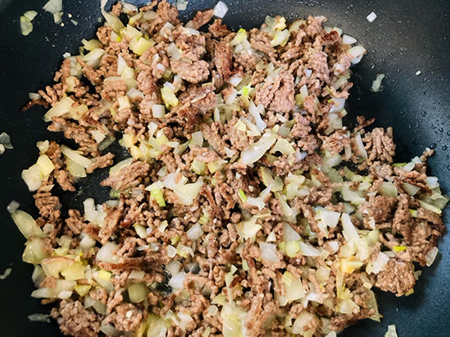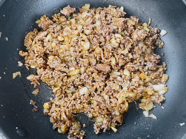 ひき肉と玉ねぎを炒めたら調味料を入れて混ぜ合わせるだけで簡単にタコミート完成♪