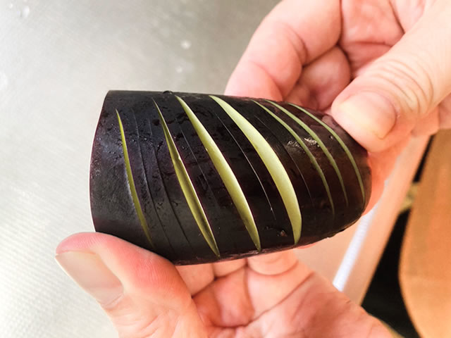 ナスは縦に半分に切り、さらに横に半分切って、4つに分け、ひとつずつに斜め横に包丁を入れ、切り込みを入れます。