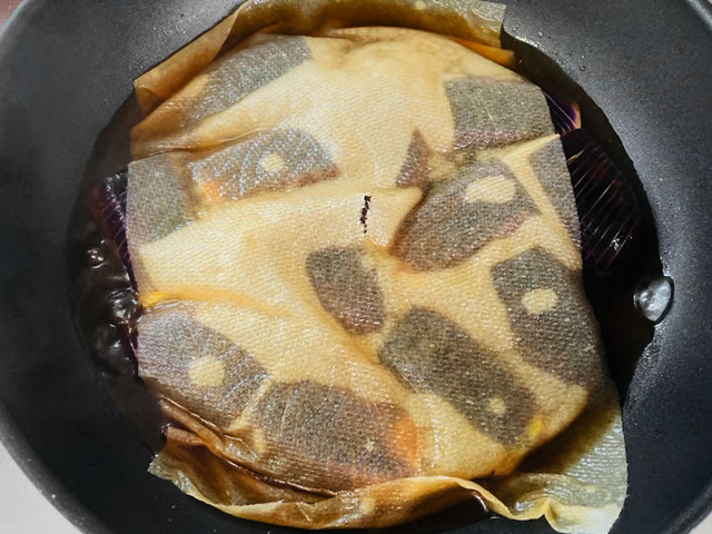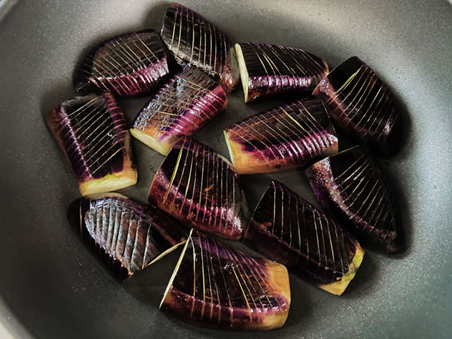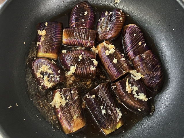 少ない油でナスを焼いたら、調味料を入れて煮るだけ!