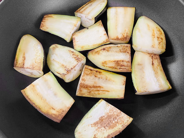 フライパンを温めたら油を引き、ナスを入れて中火で焼きます。