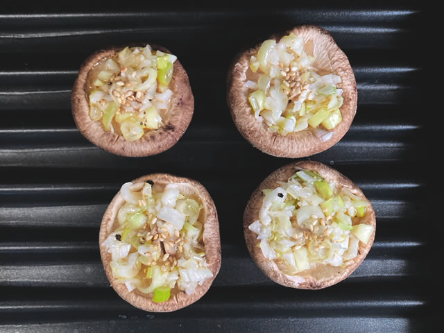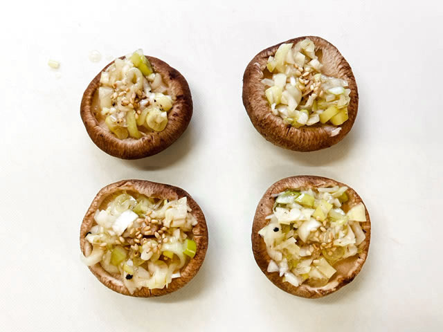 ねぎと調味料を合わせたものを椎茸に乗せ、最後にゴマを振ります。