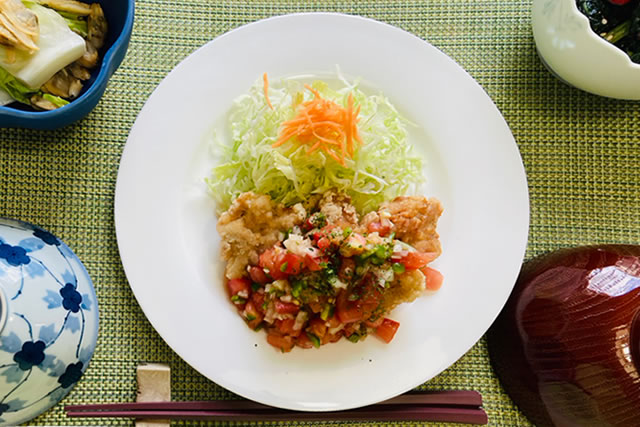 とある日のお昼ご飯♪ザンギにサルサソースを添えていただきましたよ(^^)v