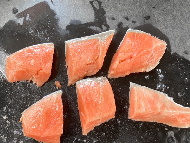 耐熱皿にネギを広げ、その上に鮭を乗せ、みりん、水をかけて、ラップをふわっとかけたら電子レンジで600ワット6分間加熱します。
