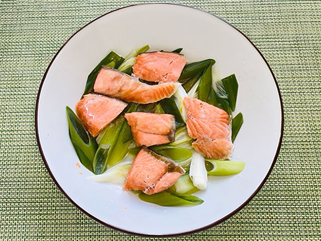 ネギと鮭を電子レンジを使って蒸すだけ!