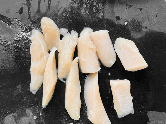 鶏ささみもさつまいもに合わせて縦に削ぎ切りにします。