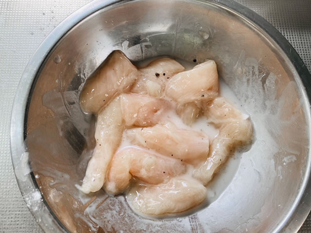 ボウル等に鶏ささみを入れ、塩、胡椒、片栗粉、水を入れたら揉んで混ぜ合わせます。